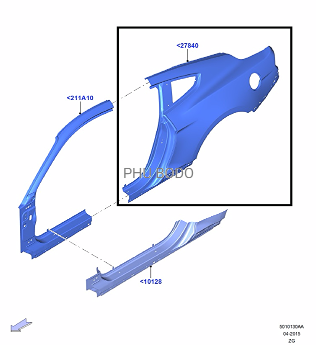 Producent OE FORD (oryginał)Przedłużenie poszycie boku prawe tylne Ford Mustang 2015-2023 / 2126781 / FR3B-6328058-AE / FR3B-6328058-AF / FR3B-6328058-AD / FR3Z-6328058-A