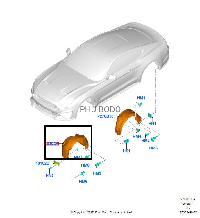 Nadkole osłona przednia lewa od rozbryzgów Ford Mustang 2018-2023 wersja z wygłuszeniem / JR3B-16A563-BD / JR3Z-16103-E / JR3B-16A563-BA / JR3B-16A563-BB / JR3B-16A563-BC